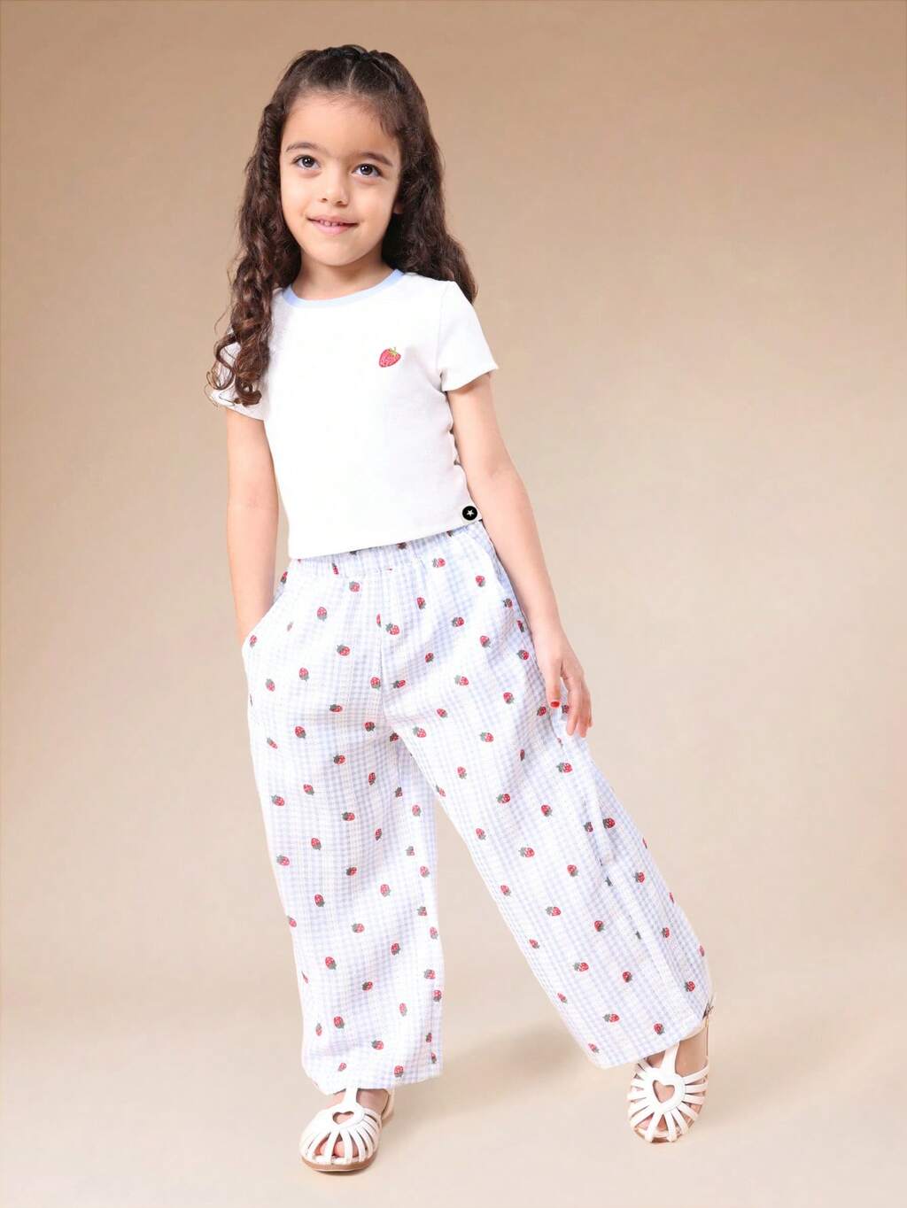 Girls Strawberry Print Set Short Sleeve Tee And Wide Leg Palazzo Pants Summer Coord Outfit