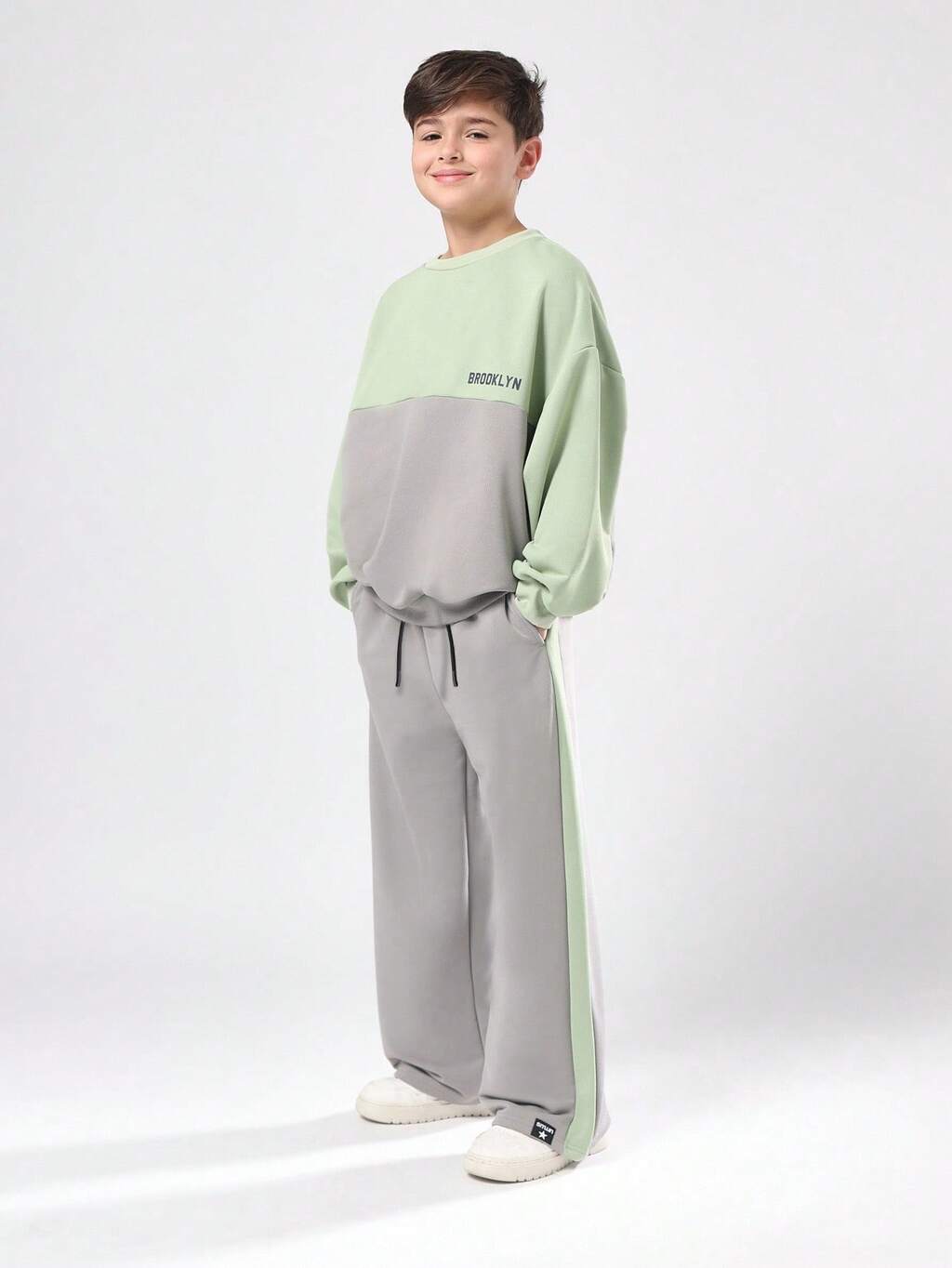 Color Block Sweatshirt And Wide Leg Pants Set With Brooklyn Text
