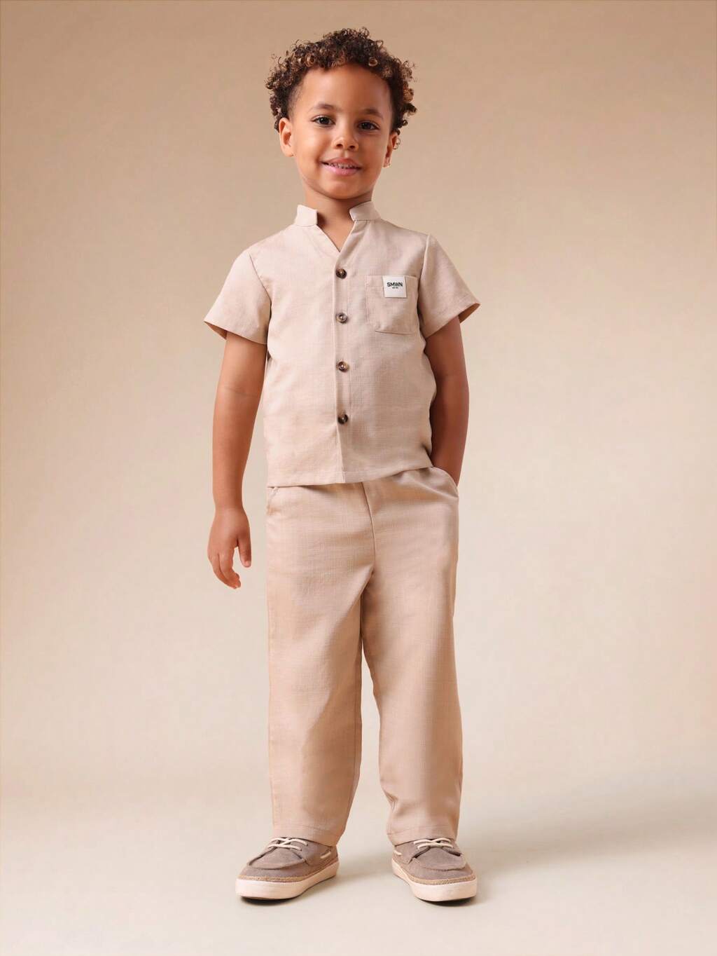 Linen Feel Shirt And Pants Set With Mandarin Collar