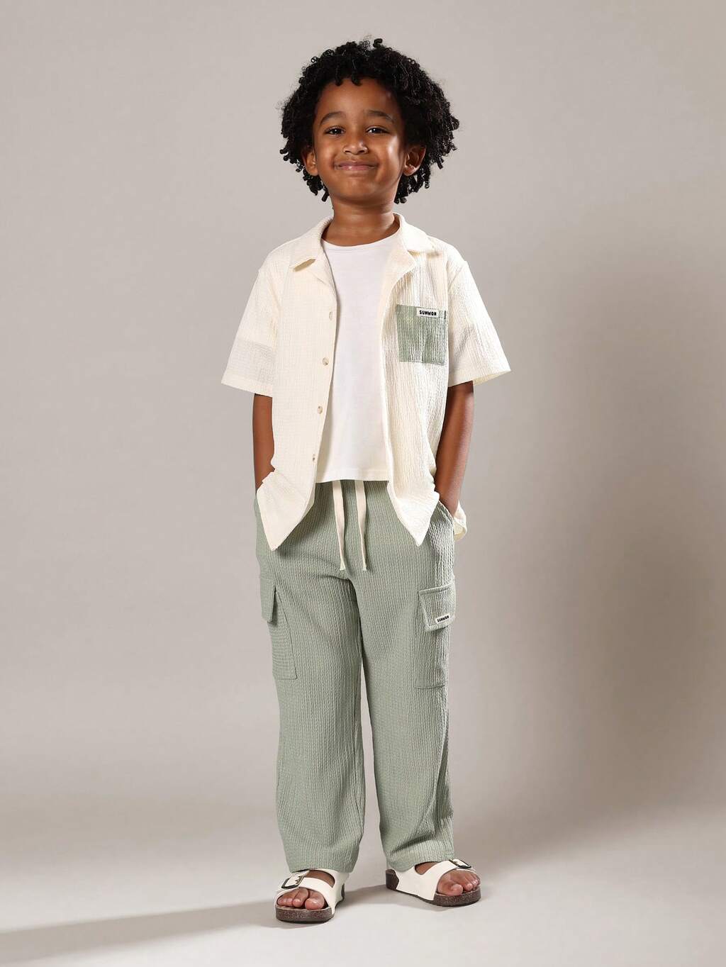 Boys White Grandad Collar Button Front Shirt And Olive Green Shorts Casual Two Piece Coordinated Set For Everyday Wear Spring Summer Outfit