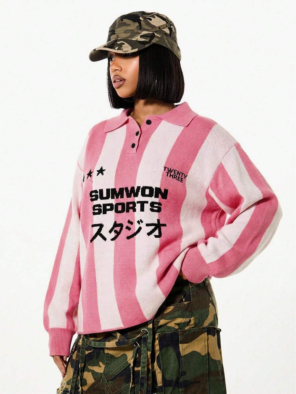 SUMWON WOMEN Oversized Tonal Stripe Knitted Polo With Japanese Graphics And Dropped Shoulder Design For Casual Streetwear Style