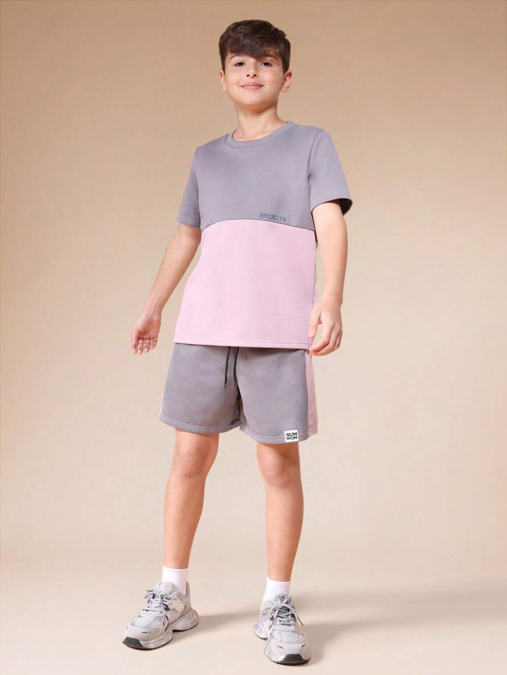 Boys Color Block Short Sleeve T-Shirt And Shorts Set Brooklyn Text Print Crew Neck Summer Casual Outfit