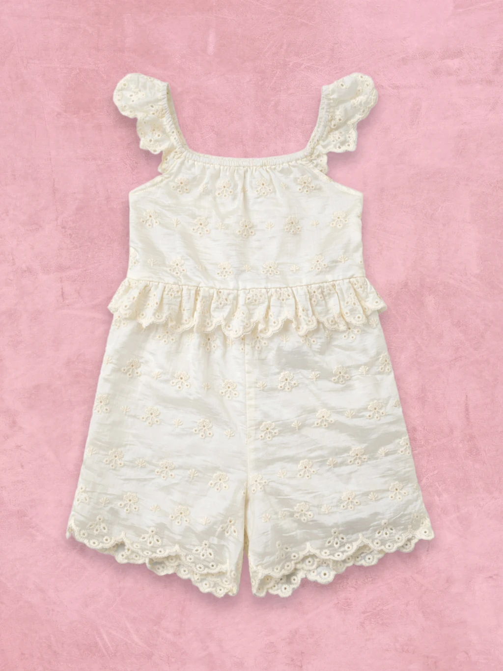 Girls Broderie Anglaise Smocked Romper With Ruffle Sleeves Eyelet Embroidered Summer Playsuit White