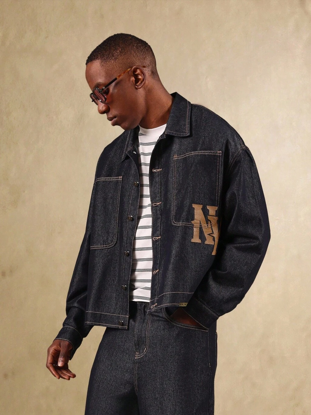 Wide Leg Raw Denim Jeans With Red Embroidered Text