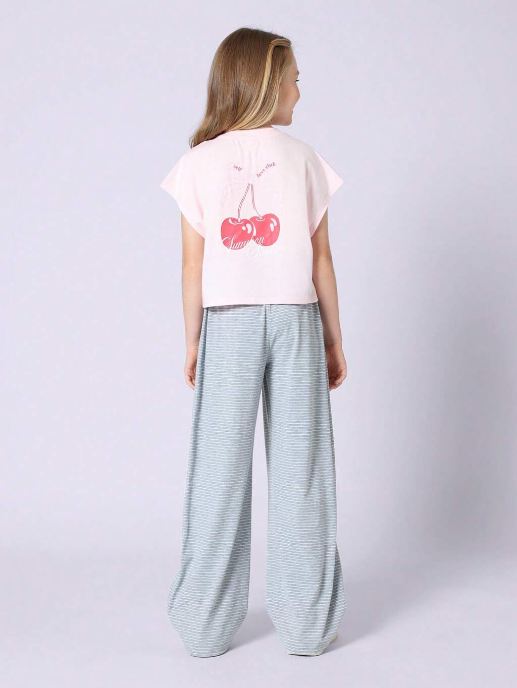 Cherry Print Crop T-Shirt With Wide Leg Striped Pants