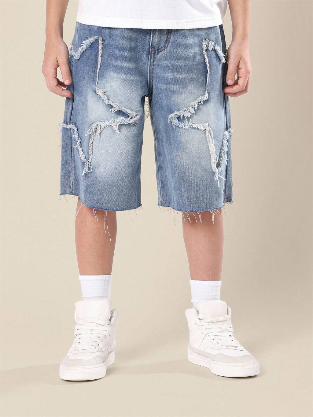 Premium Star Applique Raw Edge Mid Rise Denim Shorts