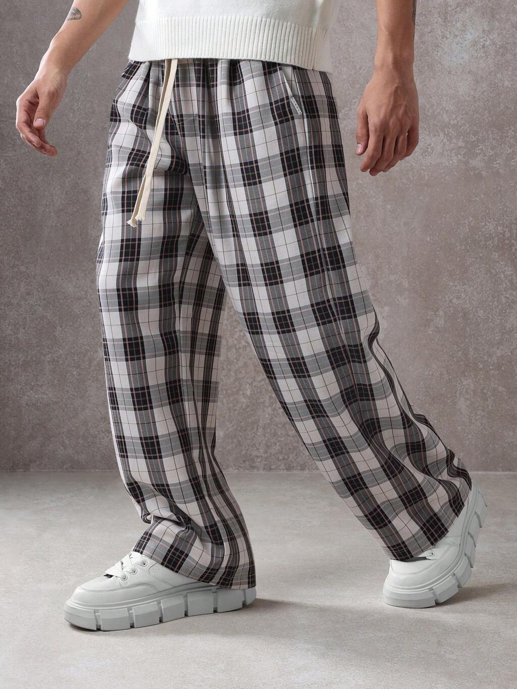 Plaid Check Relaxed Fit Drawstring Wide Leg Casual Pants