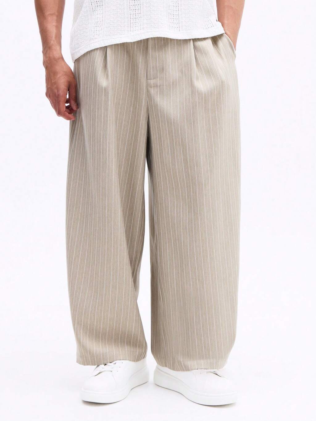 Men's Relaxed Wide Leg Cropped Linen Feel Striped Summer Pants With Vertical Pinstripe Pattern And Casual Drawstring Waist