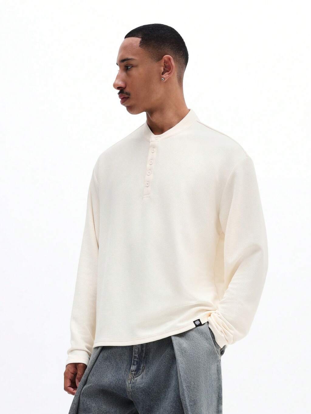 Men's Long Sleeve Henley Shirt Waffle Textured Knit Button Placket Crew Neck Casual Top Regular Fit Spring Fall Wardrobe Essential