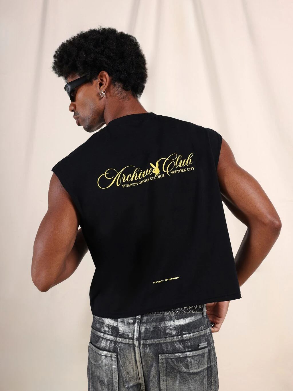 PLAYBOY X SUMWON Archive Club Sleeveless Tank Top With Gold Script Print Crew Neck Regular Fit Casual Summer Top