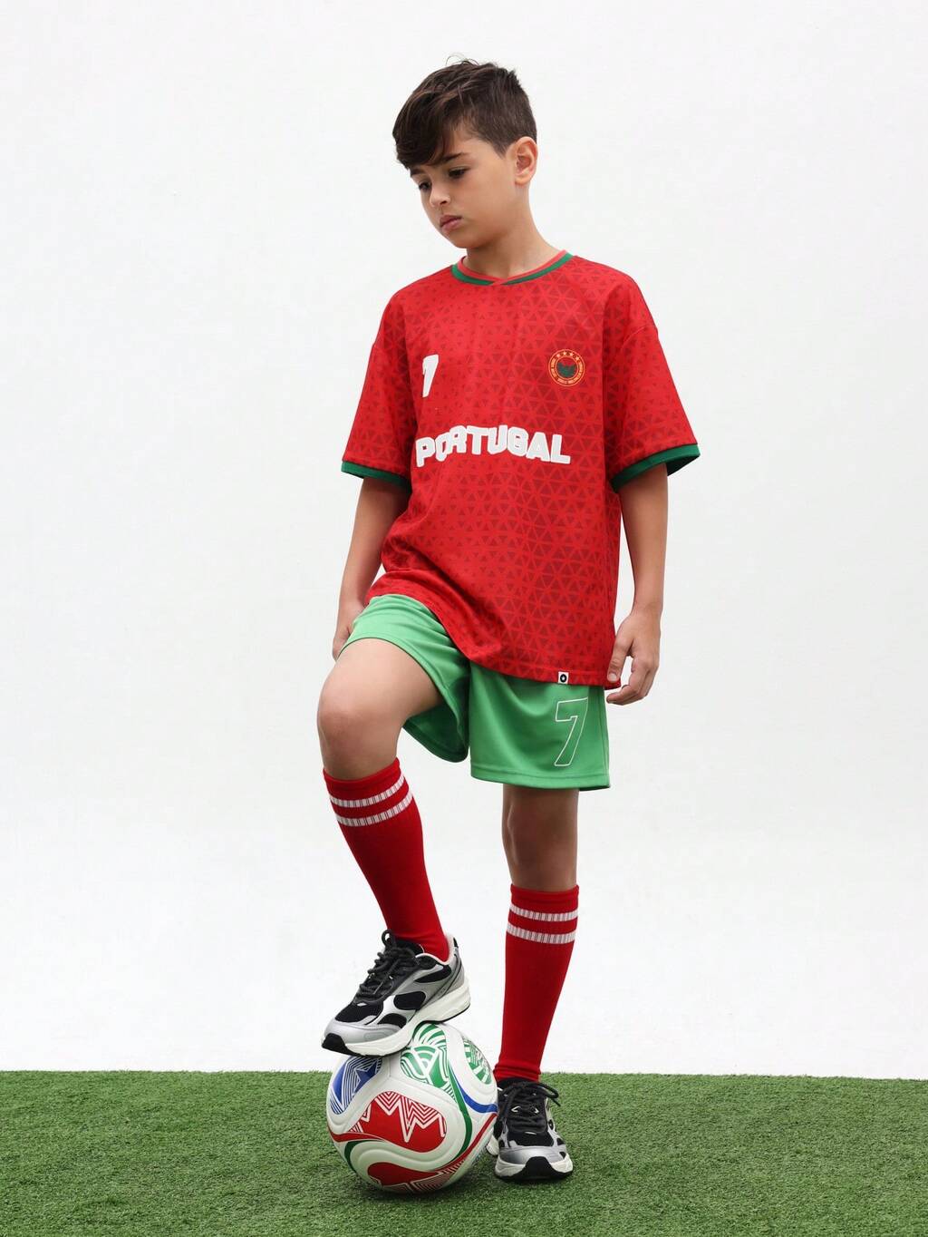 Boys Portugal Team Inspired Red Short Sleeve Jersey Tee With Green Athletic Shorts Matching Soccer Set With Number 7