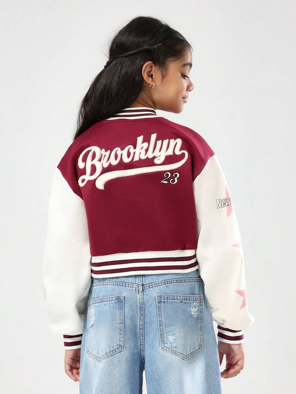 Cropped Varsity Bomber With Letter Patch And Stripes