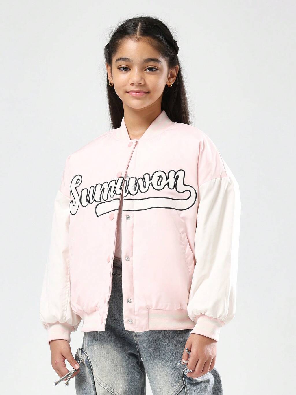 Pink Bomber Jacket With White Sleeves And Logo