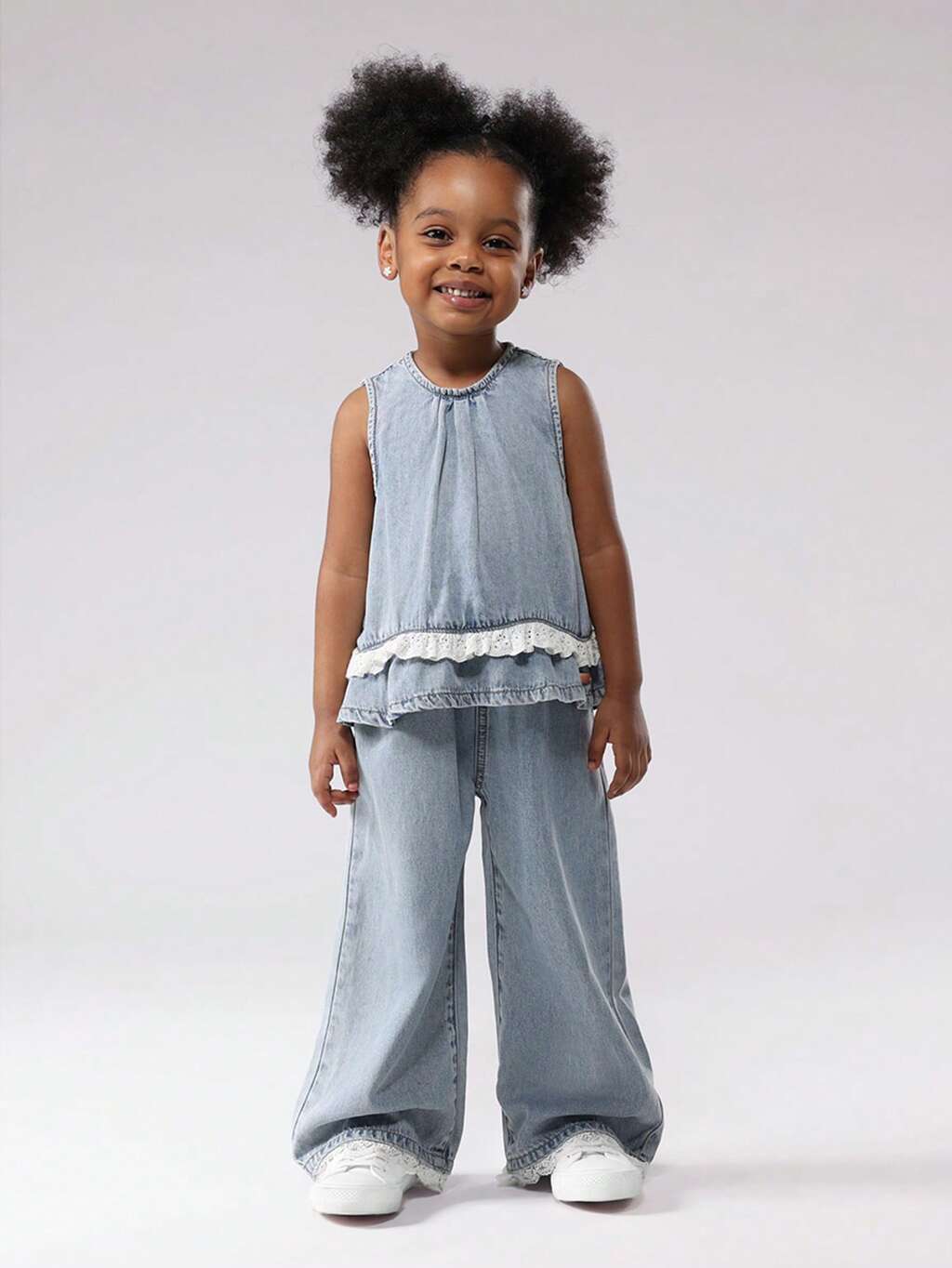 Denim Peplum Top And Wide Leg Pants With Lace Trim