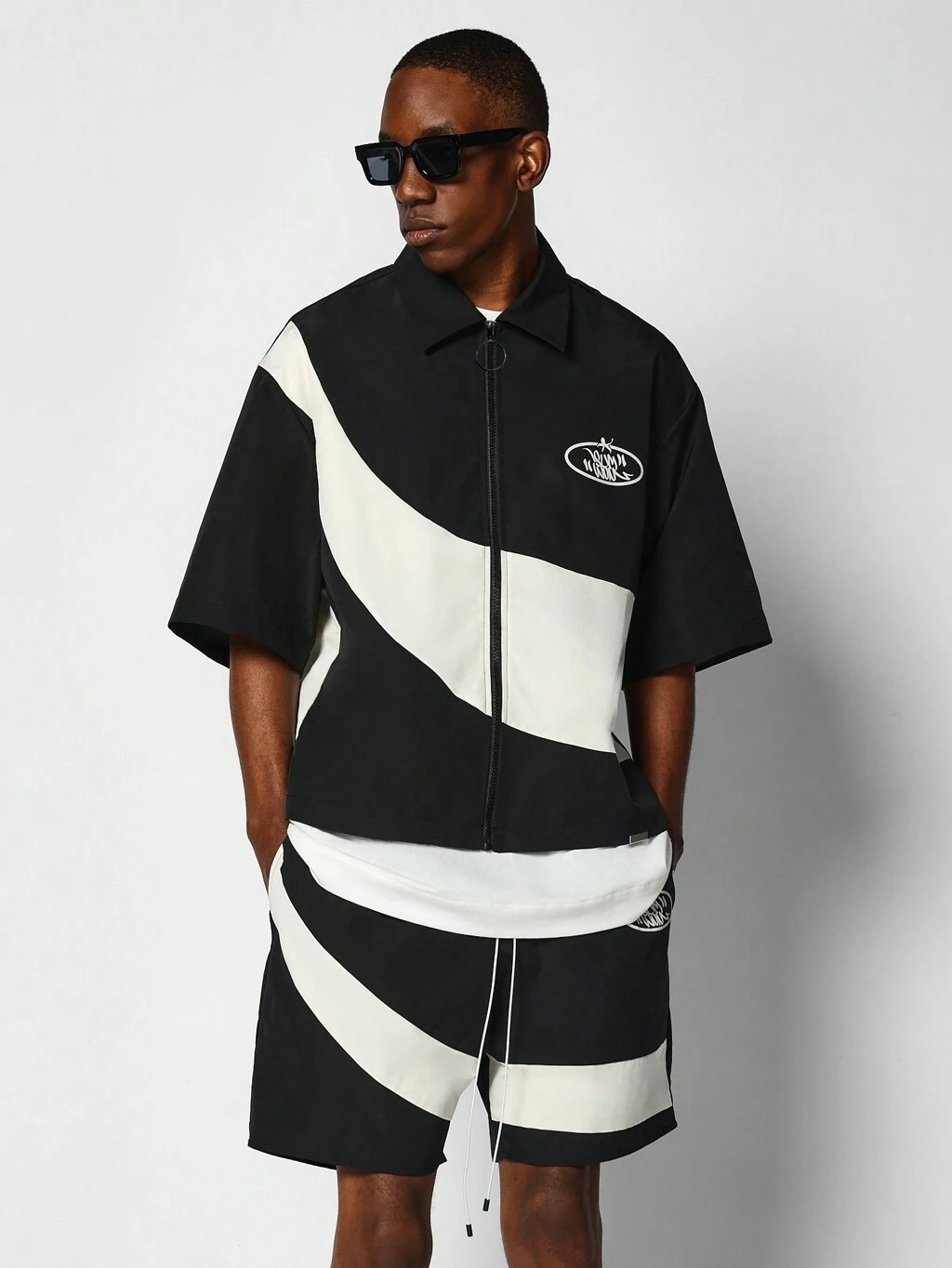 Boxy Fit Zip Through Colour Blocked Short Sleeve Nylon Shirt And Short 2 Piece Set