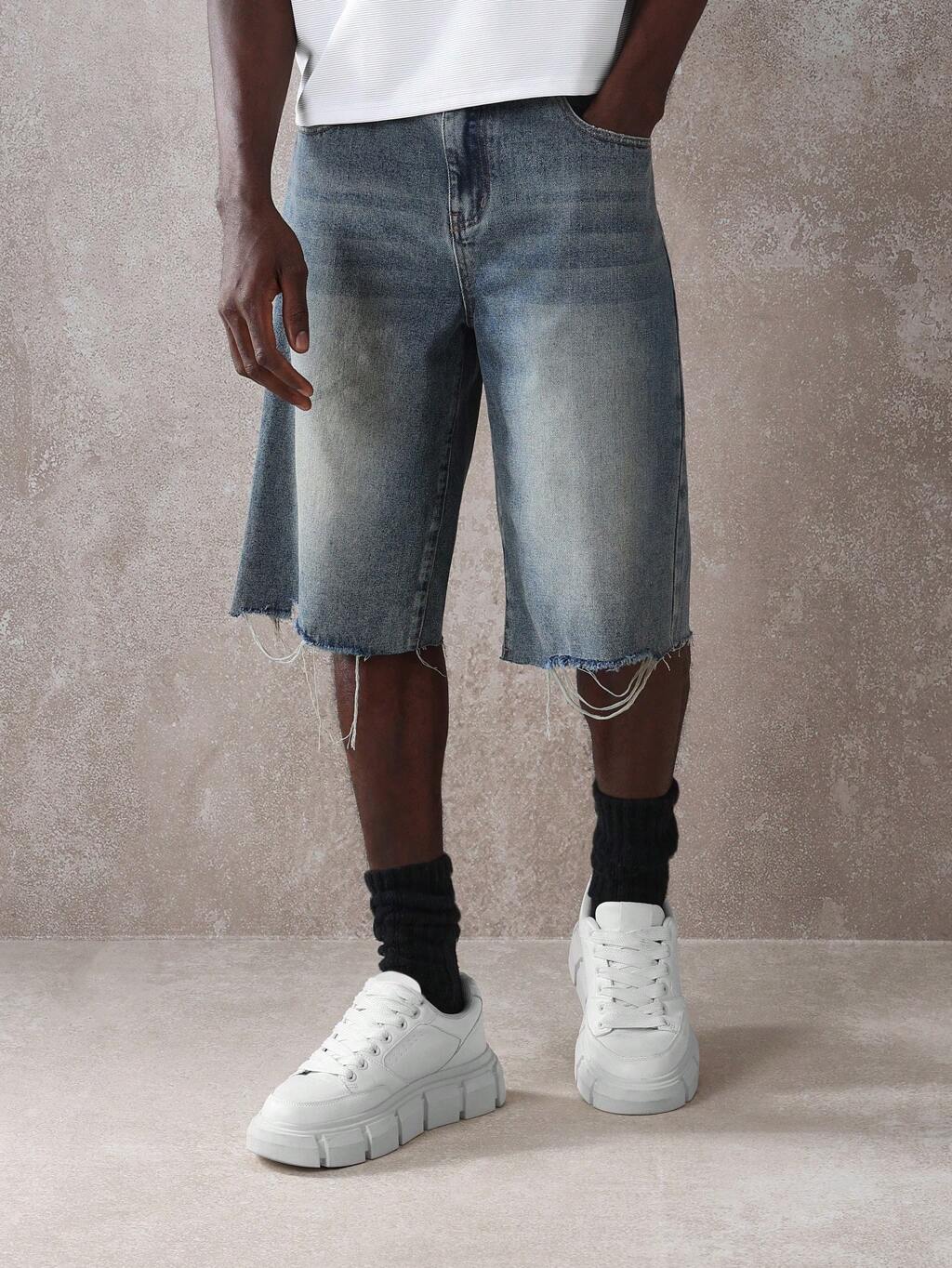 Distressed Bermuda Length Frayed Hem Relaxed Fit Denim Shorts