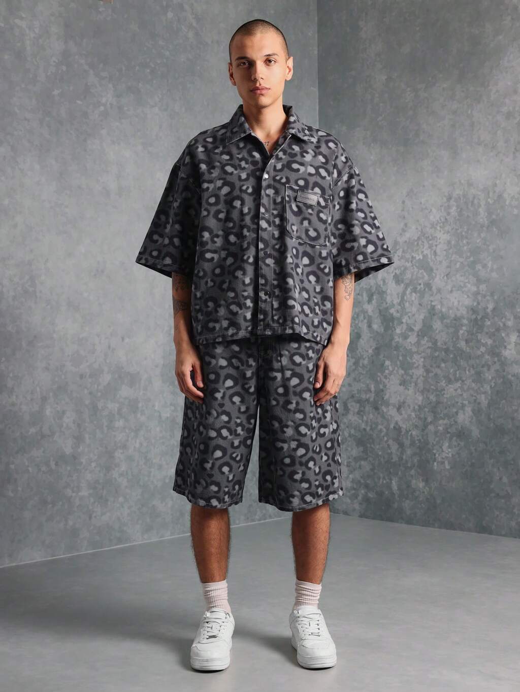 Men Denim Co-Ords Designer Leopard Print Short Sleeve Set
