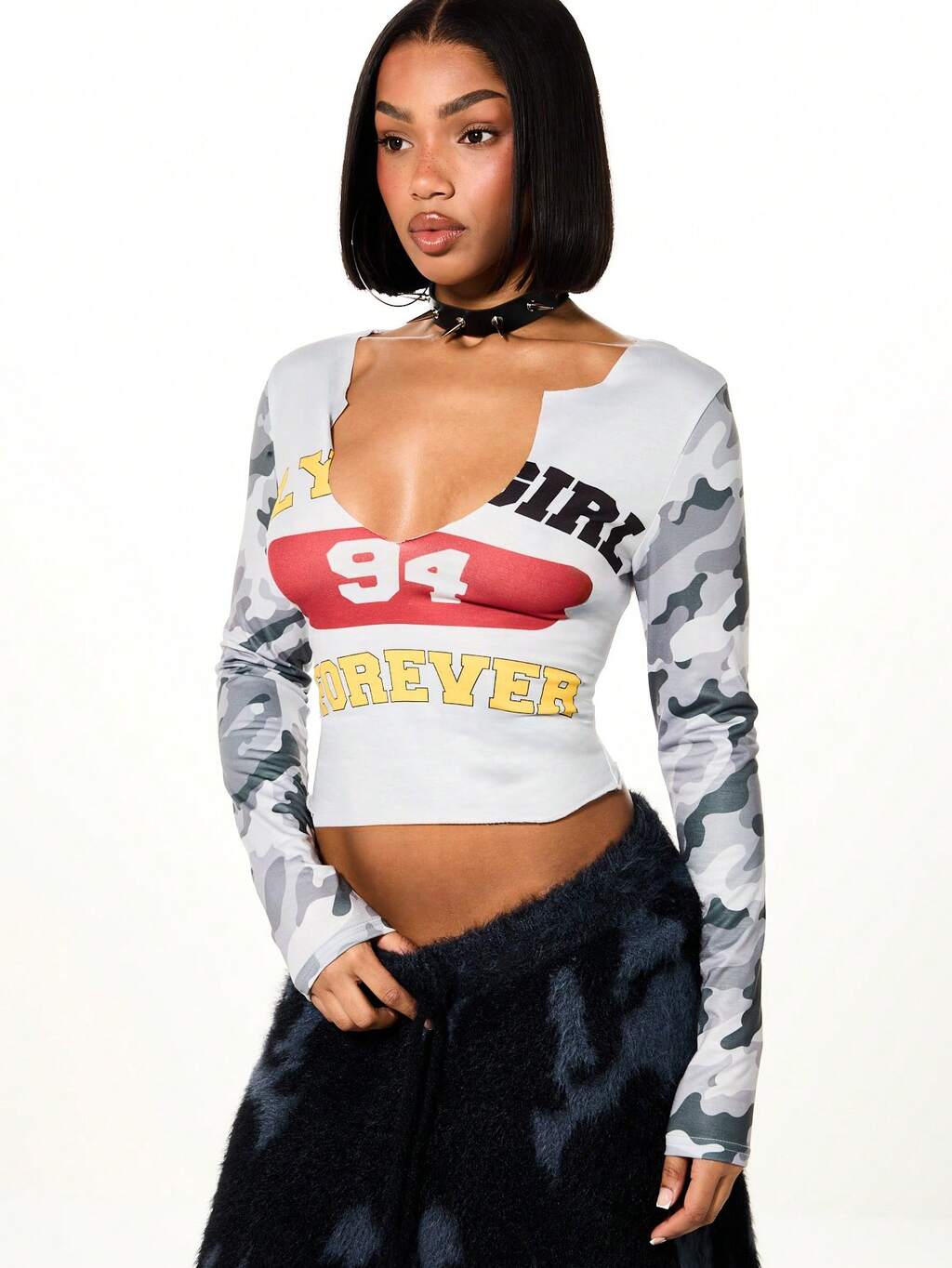 SUMWON WOMEN Camouflage-Crop-Top mit kontrastierenden Ärmeln und Grafikprint