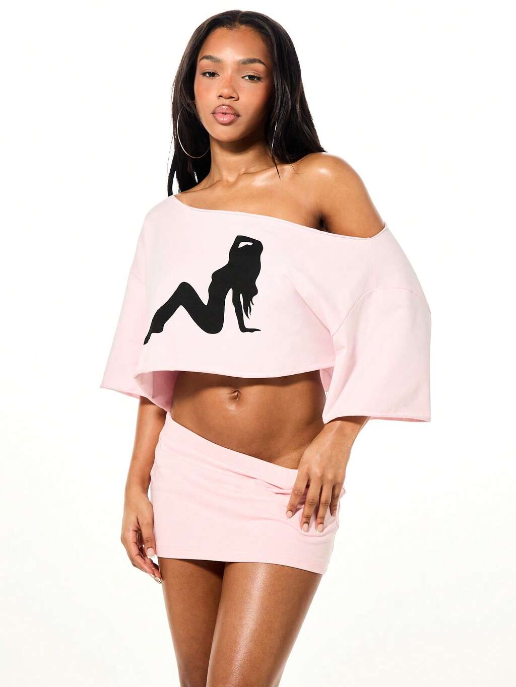 SUMWON WOMEN Schulterfreies, kurzes Top mit Grafikprint und weiten Ärmeln