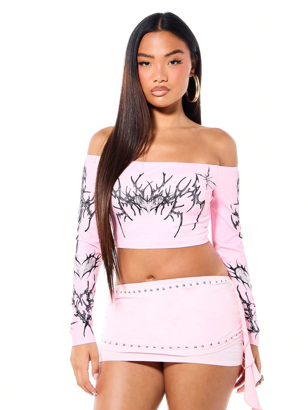 SUMWON WOMEN Gothic Barbed Wire Muster Off-Shoulder Crop Top Langarm Grunge Alternative Ästhetik Rosa Schwarz Nieten Top