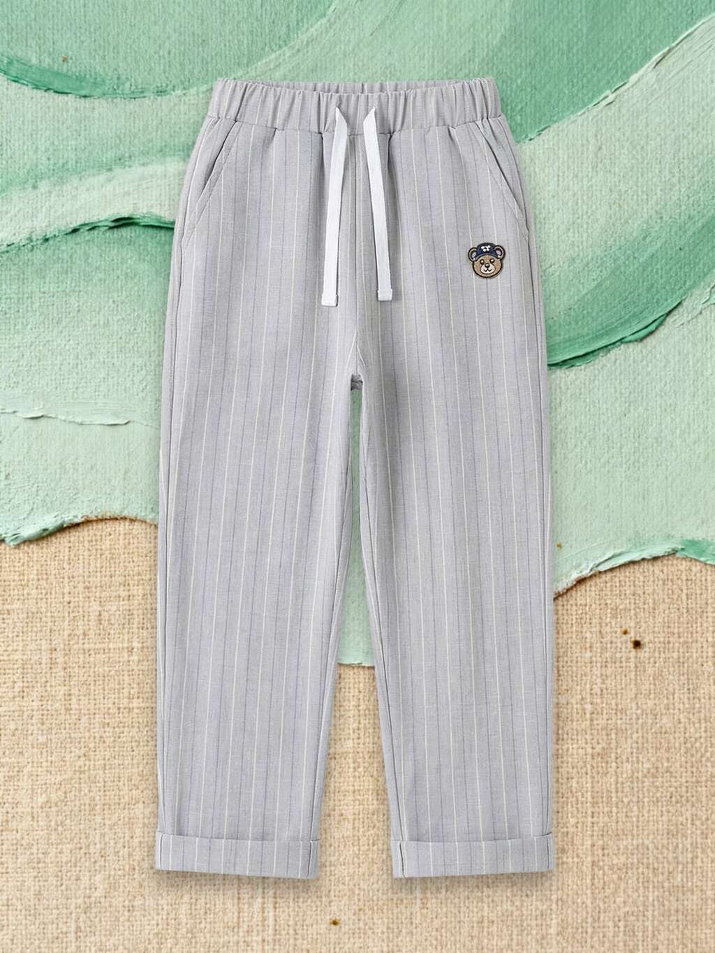 Gestreifte Jungenhosen mit Kordelzug und Affenfleck, elastischer Bund, lässige Alltagshosen mit umgeschlagenem Saum, bequeme Kinder-Jogginghosen-Stil Hosen