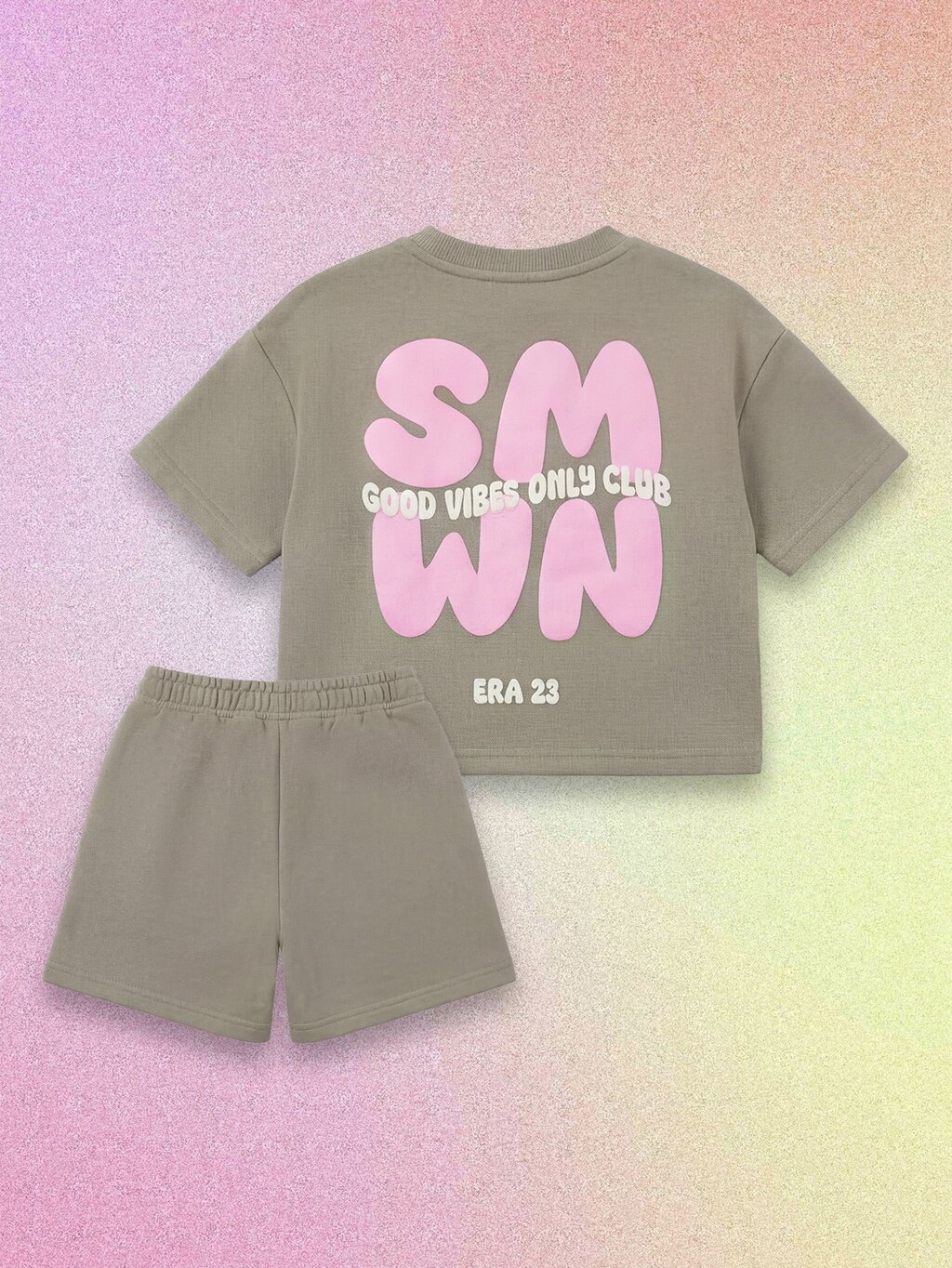 Oversized salbeigrünes T-Shirt und Shorts Co-Ord Set mit rosa Textdruck "Good Vibes Only Club Era 23" Mädchen Casual Sommer Outfit