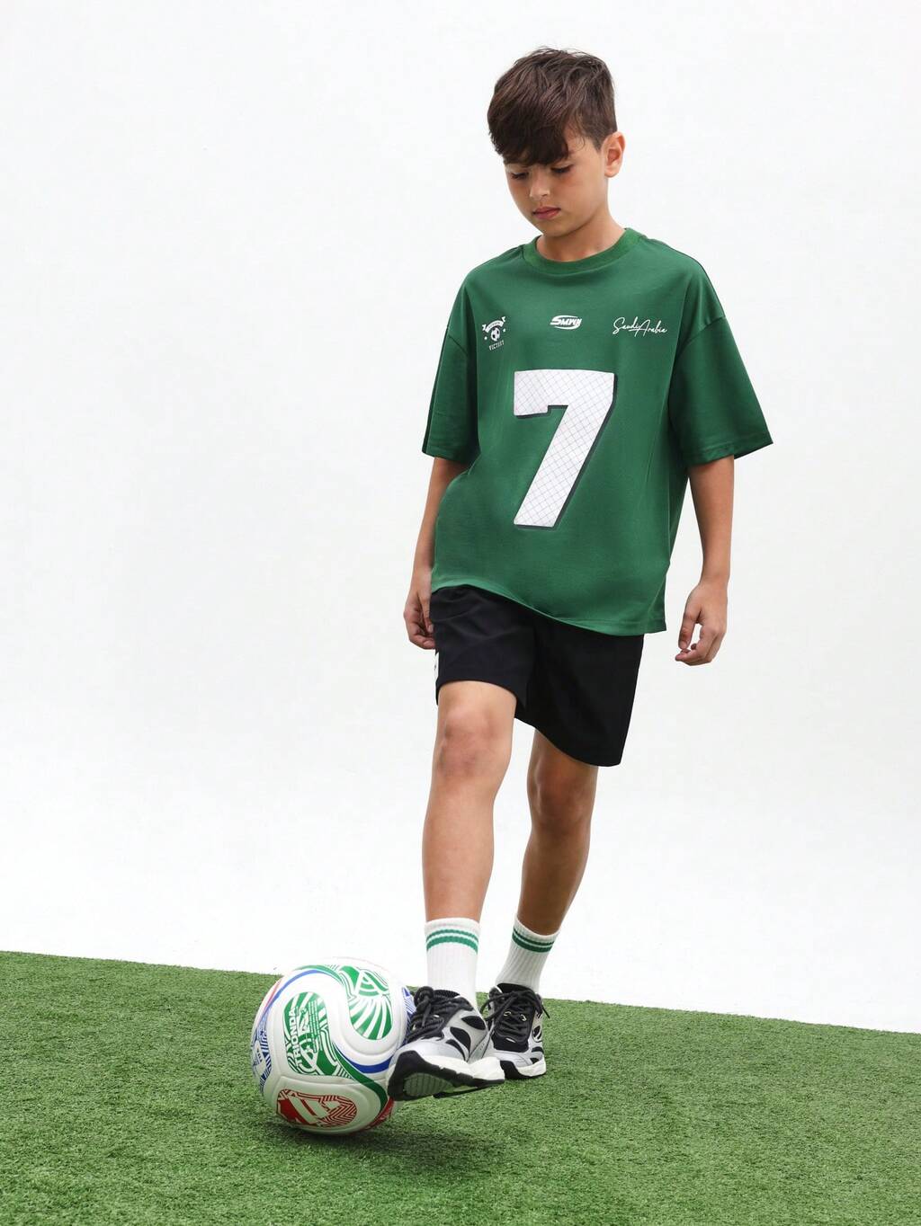 Jungen Grünes Mesh Sport Trikot mit weißer Nummer 7 Aufdruck und Saudi-Arabien Signatur Design, Regular Fit Kurzarm, Weltmeisterschaft
