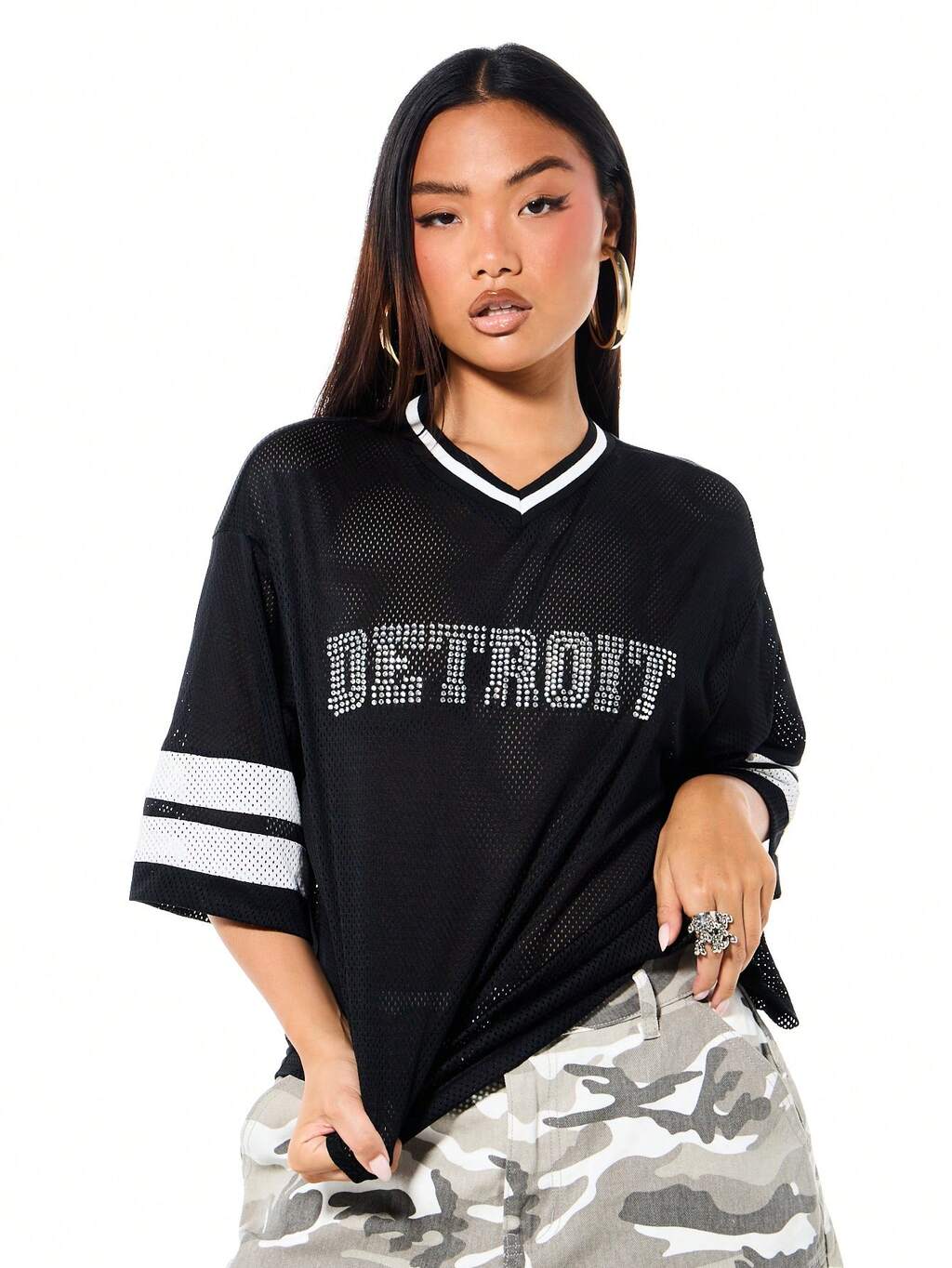 SUMWON WOMEN Parte superior de malla con cuello en V, mangas a rayas contrastantes y detalles de texto con pedrería, de corte holgado y cropped, tipo jersey universitario de Detroit