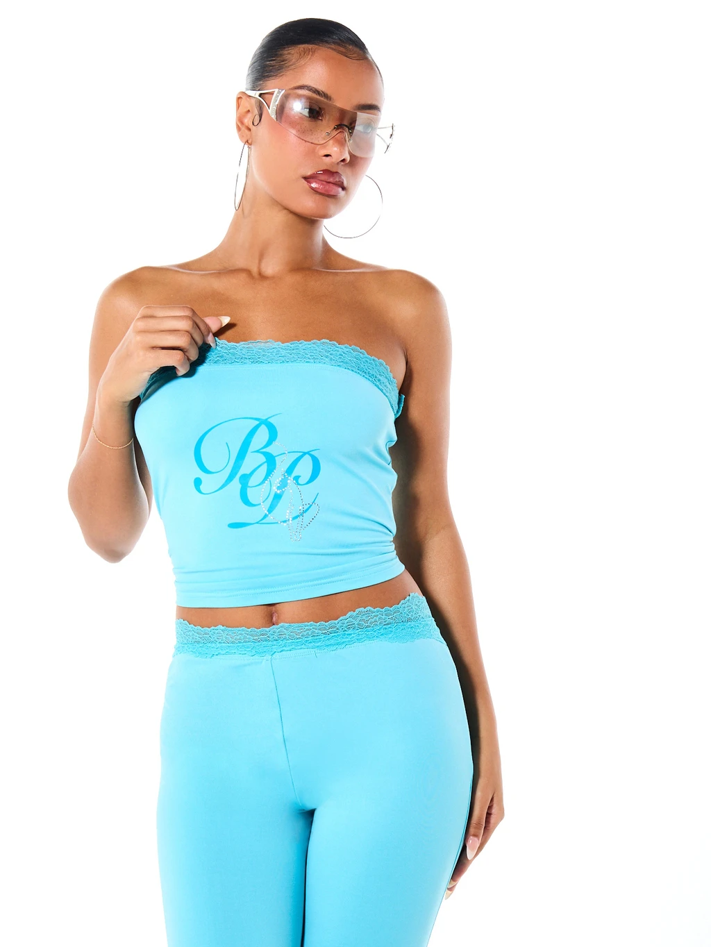 BABYPHAT Top corto sin tirantes con detalle de logotipo bordado, en color azul claro, con borde de encaje y estilo de top tubo para el verano