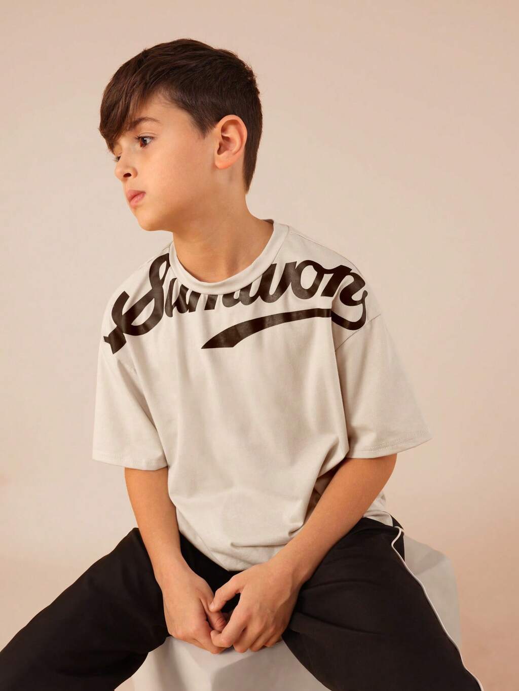 Conjunto de camiseta y pantalones cortos de niño con estampado de estrellas gris oversize, cuello redondo, mangas cortas, diseño inspirado en el fútbol, conjunto casual de verano, Copa Mundial