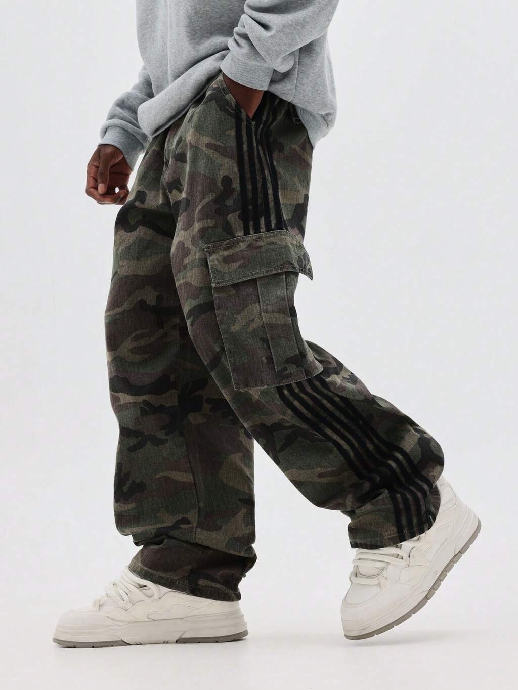 Pantalones cargo de pierna ancha con estampado de camuflaje y rayas laterales