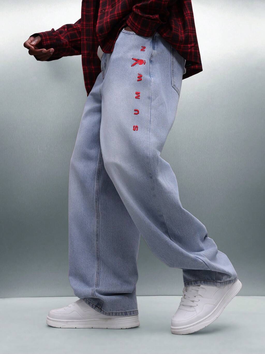 PLAYBOY X SUMWON Vaqueros anchos de lavado claro con bordado rojo