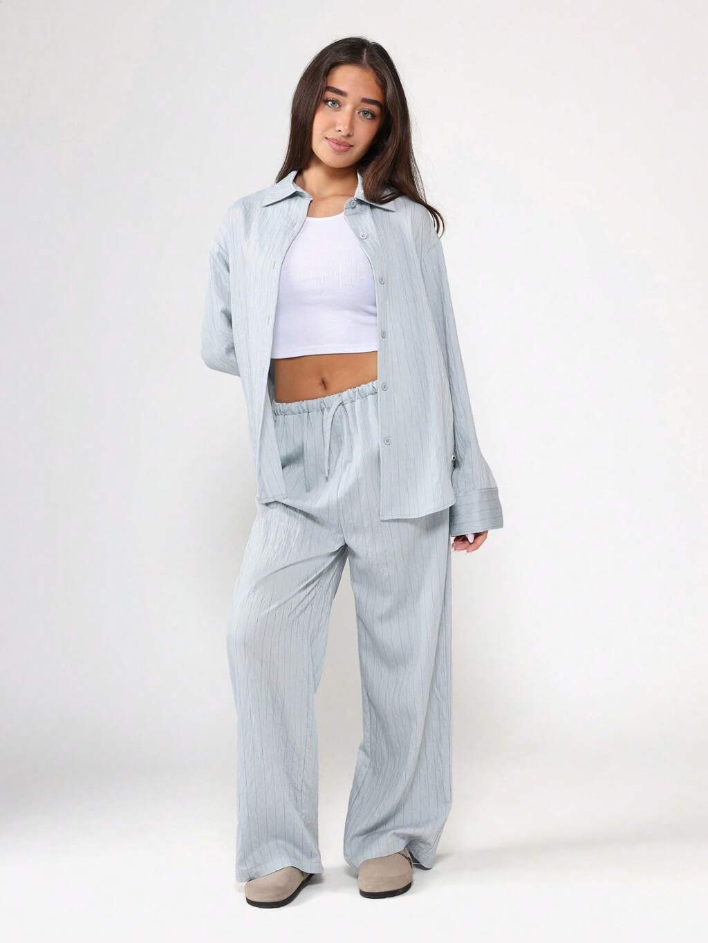 Camisa de rayas con botones y pantalones anchos
