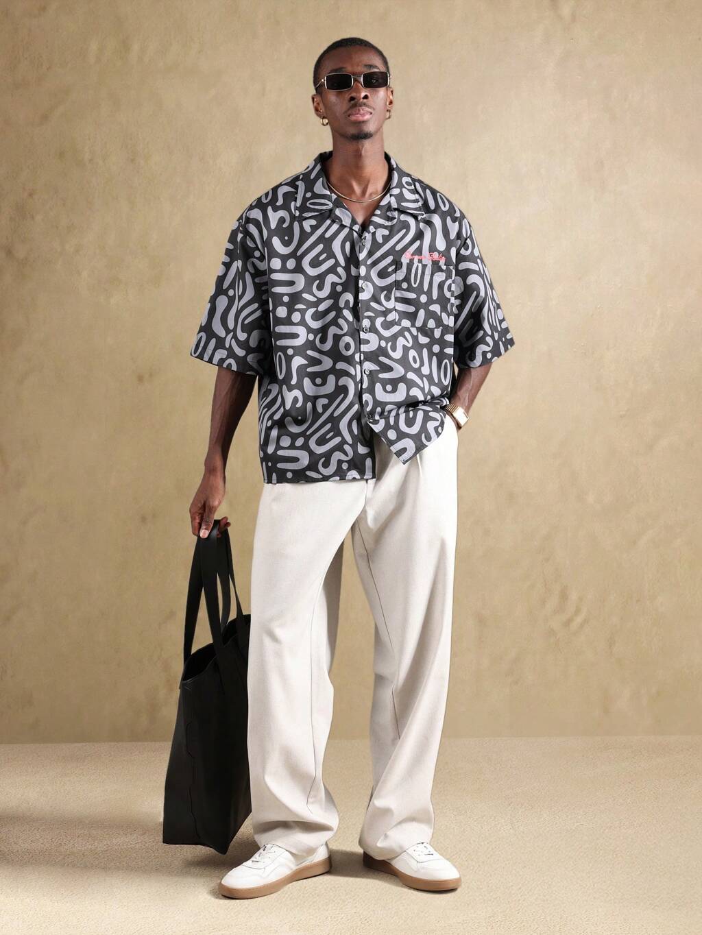 Camisa de botones con estampado abstracto, manga corta, corte cuadrado, cuello campamento, talla grande