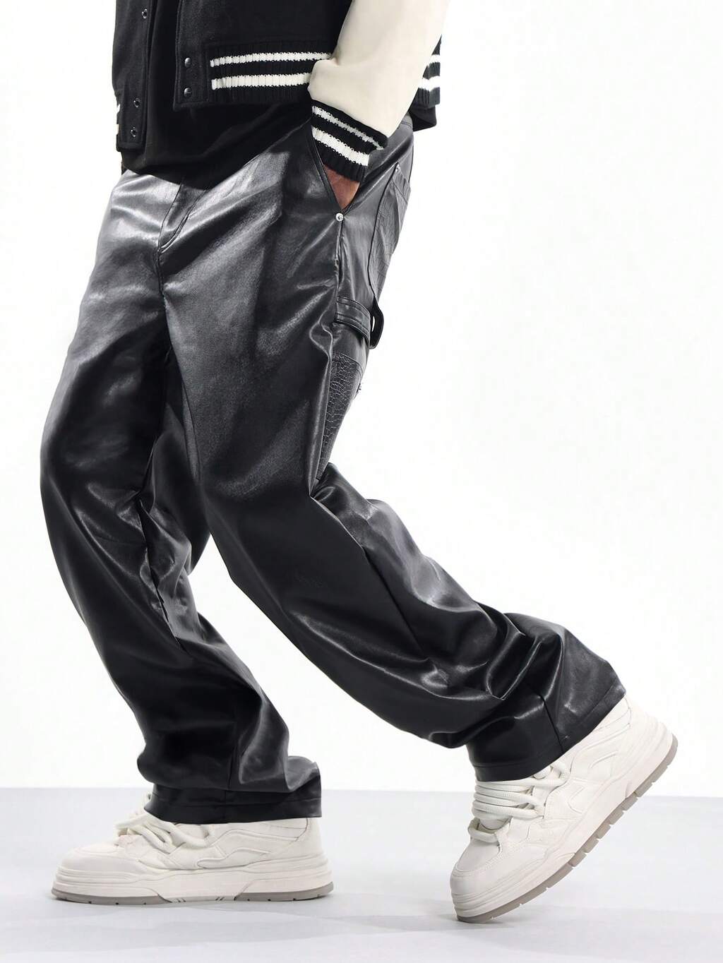 Pantalones holgados de piel sintética con paneles estilo skater y cordón ajustable