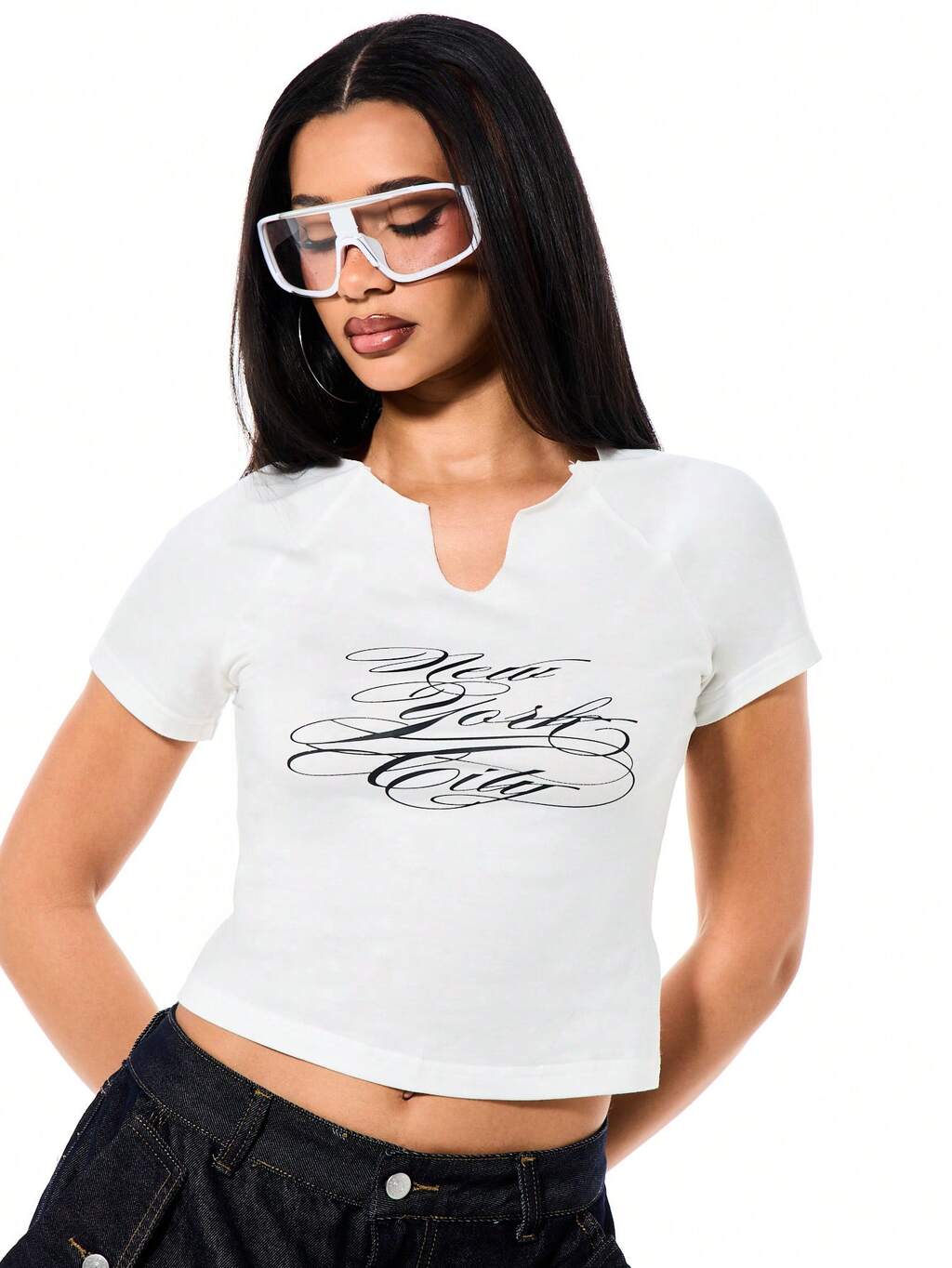 SUMWON WOMEN T-shirt graphique court à col cranté avec imprimé script