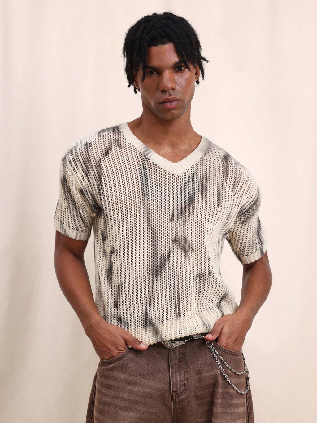 Top décontracté à manches courtes en tricot à col en V avec effet tie dye, coupe ample, style décontracté et léger pour l'été