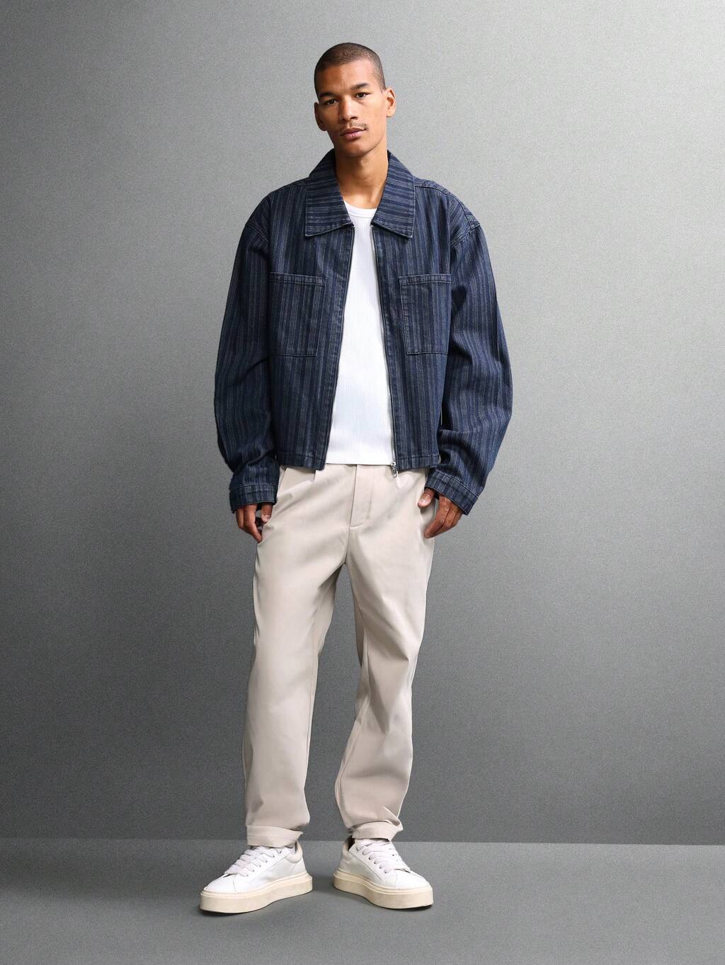 Veste en jean à fines rayures avec fermeture éclair sur le devant et poches plaquées