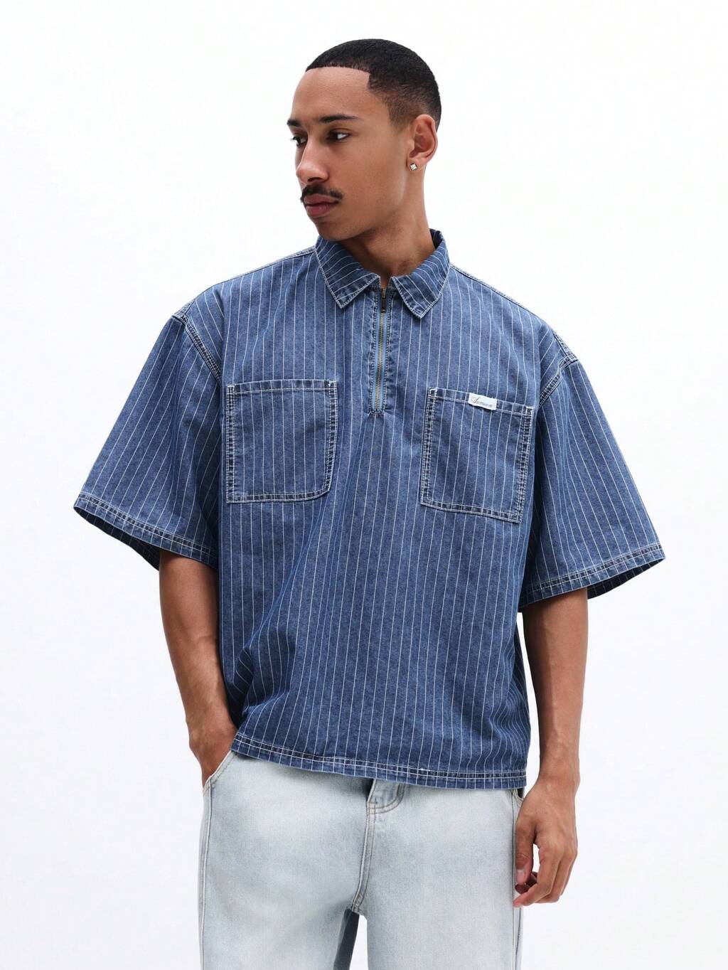 Chemise décontractée d'été à manches courtes, zip avant, poches poitrine, coupe oversize, en denim bleu clair rayé pour hommes