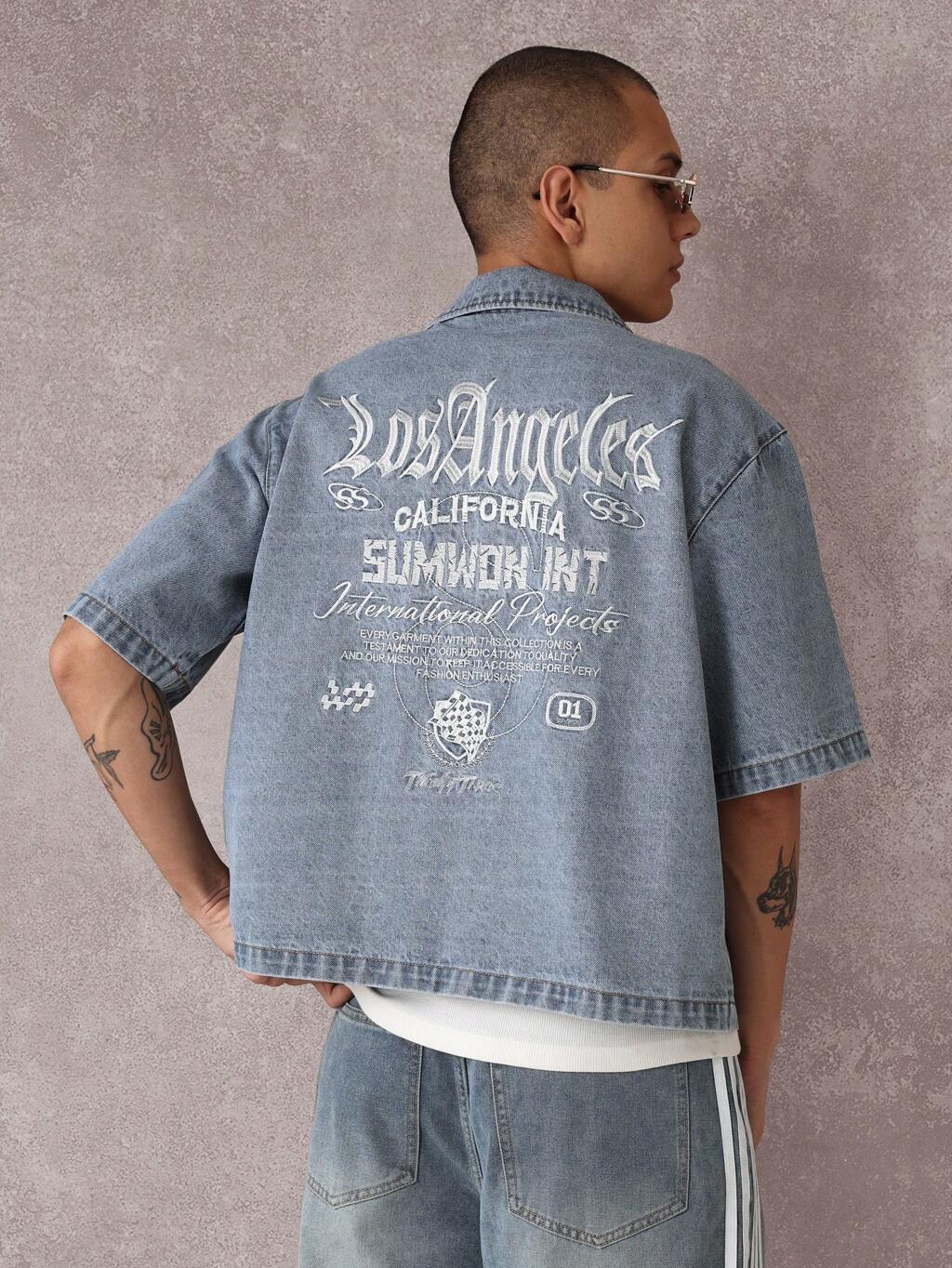Chemise en denim à coupe carrée et à imprimé graphique avec texte sur toute la surface