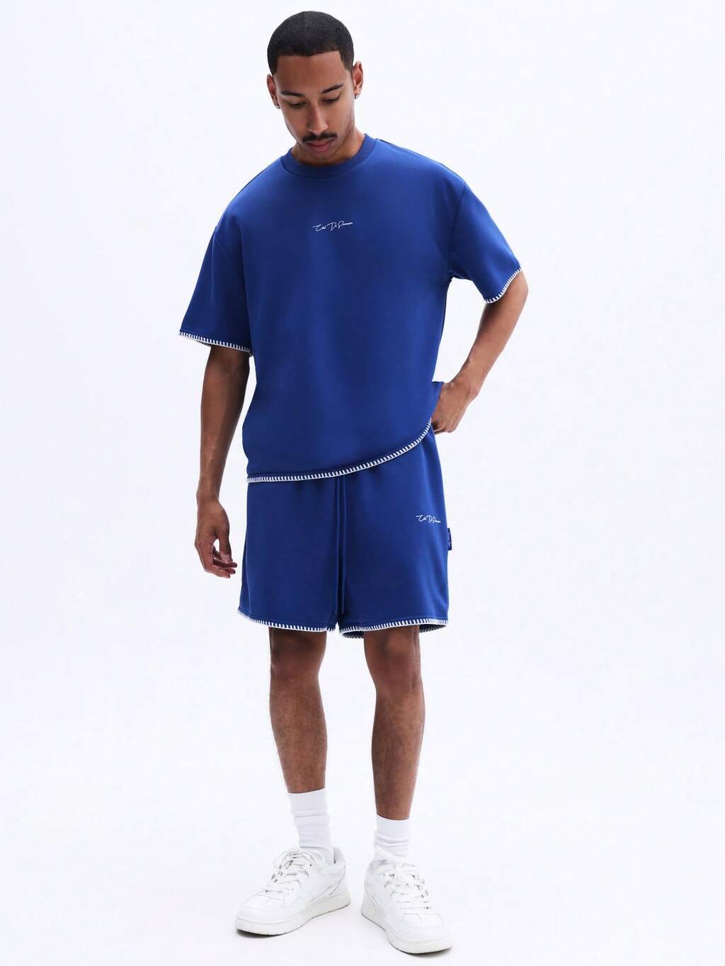 Ensemble coordonné de t-shirt col rond et short pour homme avec logo brodé et surpiqûres contrastées pour le port décontracté en été