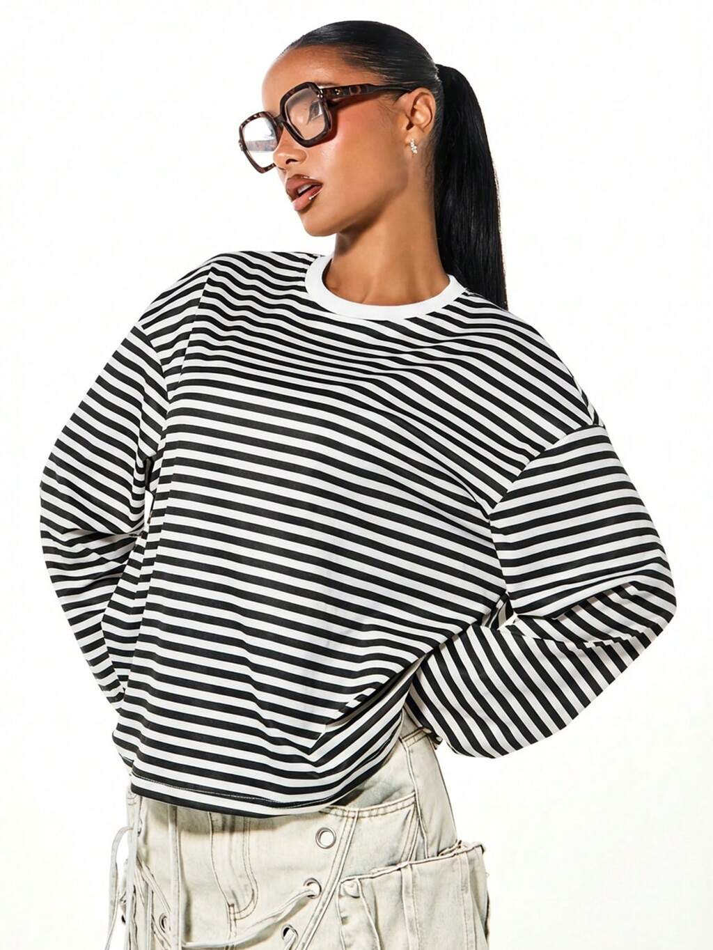 SUMWON WOMEN Top court à manches longues rayé pour femmes avec décolleté en V et découpe à l'avant, en tricot côtelé, mode automne décontracté ajusté