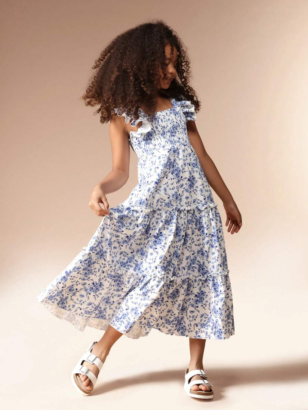 Robe midi à fleurs avec taille élastique, col carré froncé, manches à volants et jupe étagée pour filles pré-adolescentes, style printemps-été