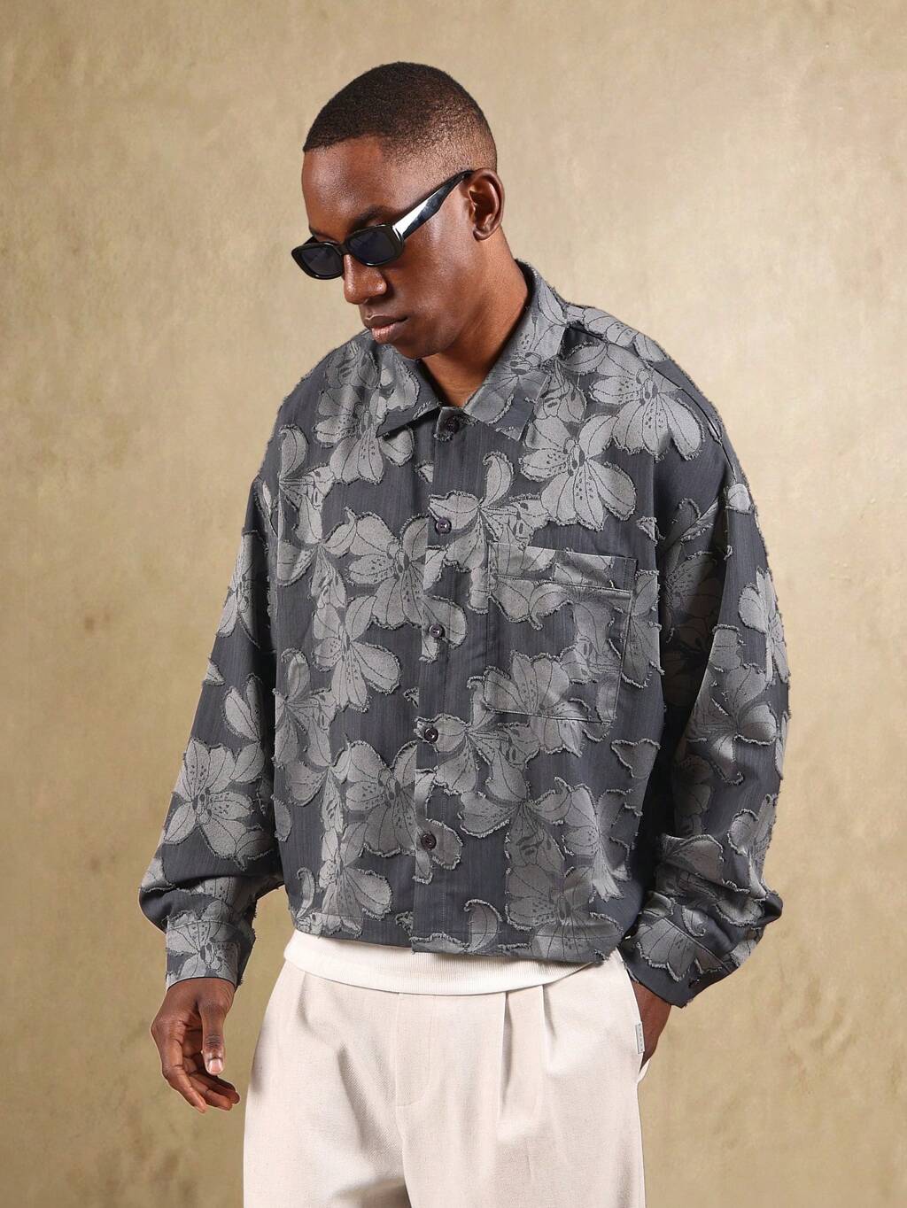 Chemise boutonnée à motif jacquard floral et coupe oversize