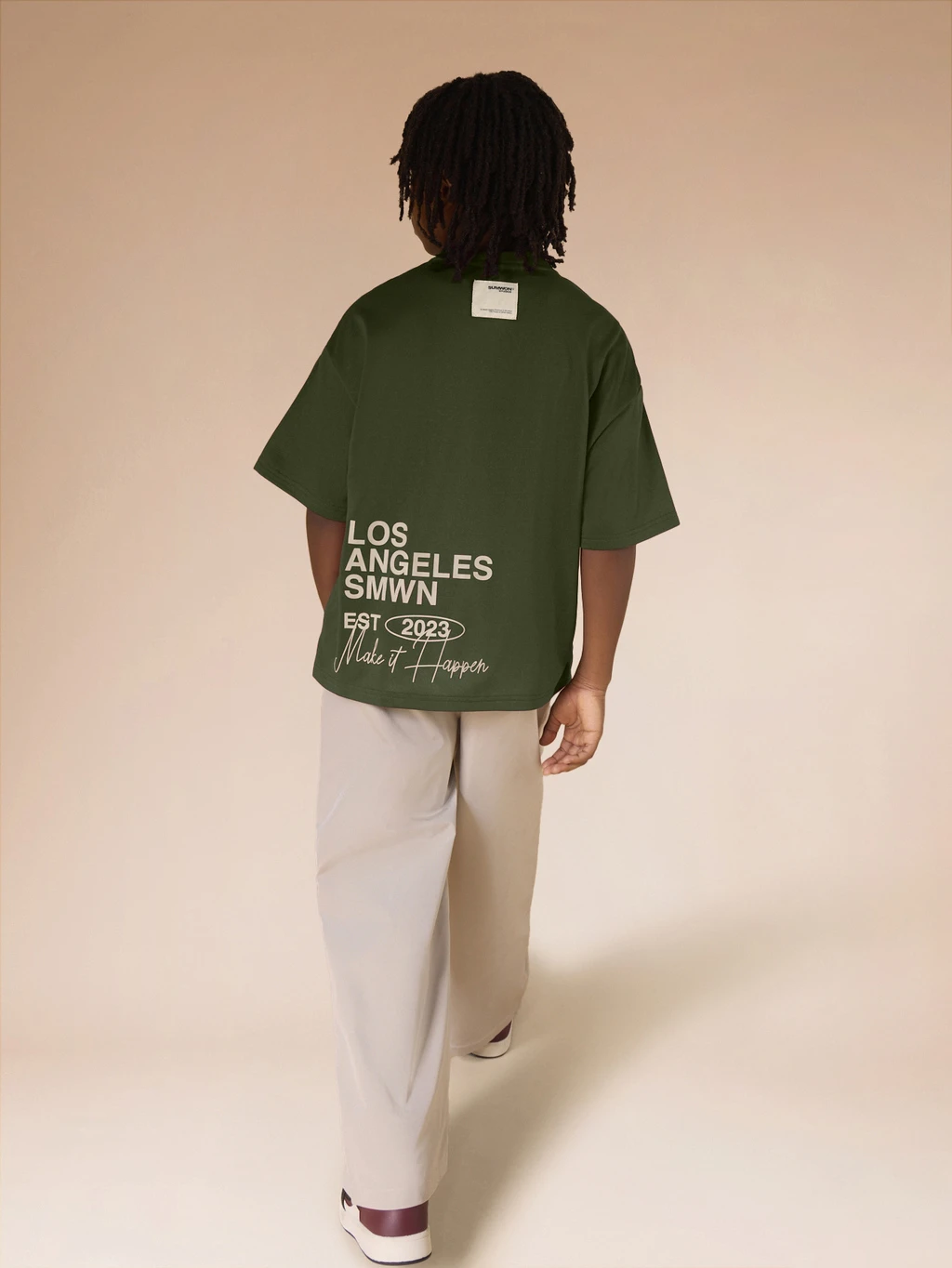 Maglietta oversize con grafica per ragazzi pre-adolescenti, girocollo, maniche corte, casual, per uso quotidiano estivo, con scritta "Los Angeles Make It Happen"