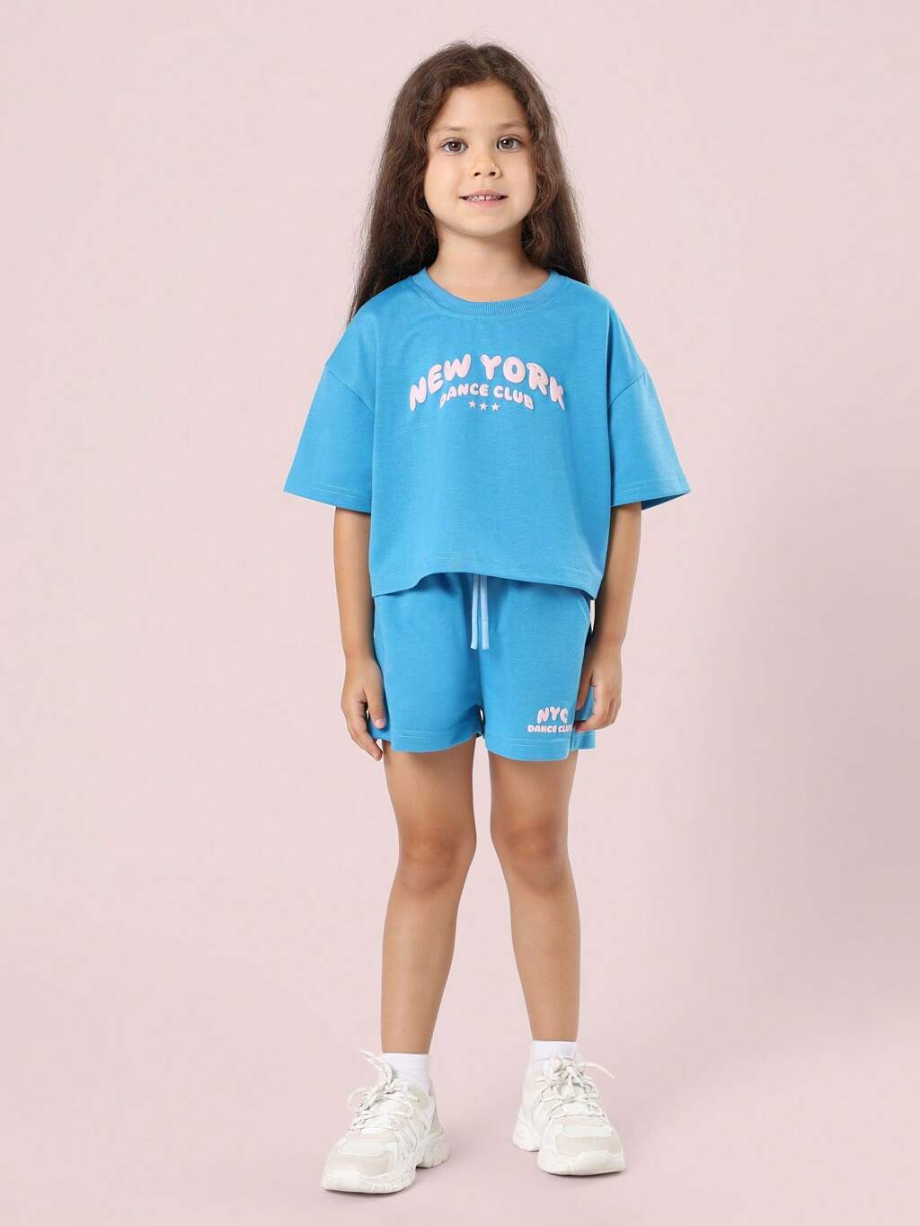 Set coordinato estivo casual da ragazza con maglietta a girocollo a maniche corte e pantaloncini di colore lilla, con stampa di testo e dettagli sul pannello laterale