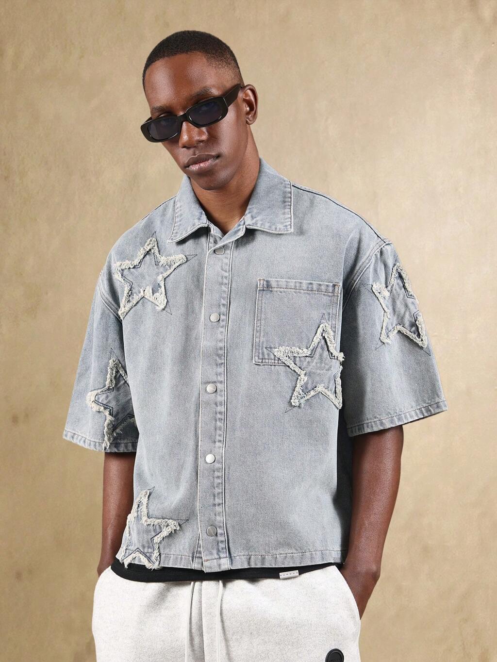 Camicia in denim con applicazione a stella invecchiata e bordi sfrangiati