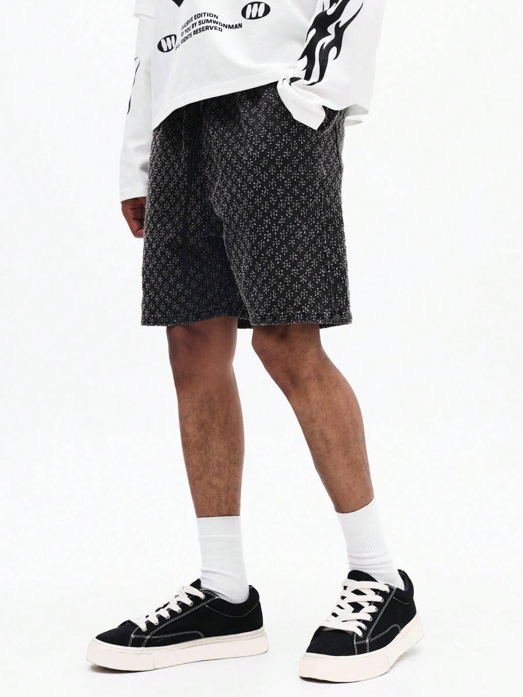 Pantaloncini di jeans con texture e stampa all-over, stile casual estivo, vestibilità rilassata, lunghezza sopra il ginocchio, stile da strada