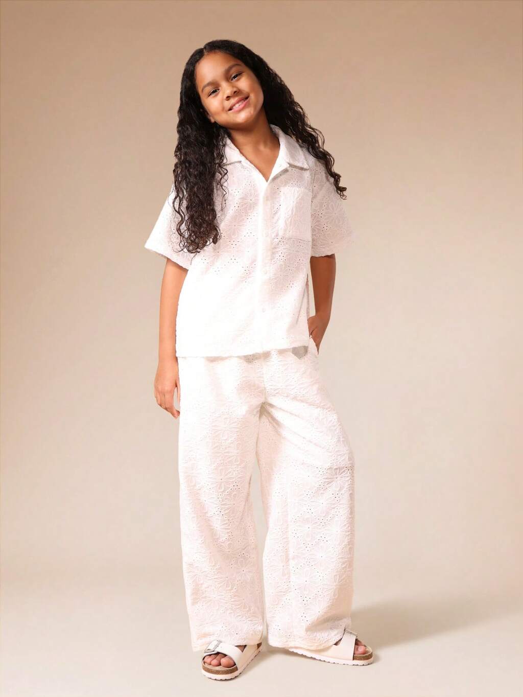 Set coordinato per ragazze pre-adolescenti, composto da camicia a maniche corte in broderie anglaise bianca e pantaloni a gamba ampia, adatto per vacanze estive