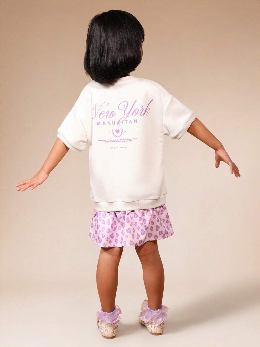 Abito estivo casual da ragazza in stile t-shirt con collo a equipaggio, in misto cotone, a maniche corte, con stampa di Manhattan e gonna a motivo leopardato